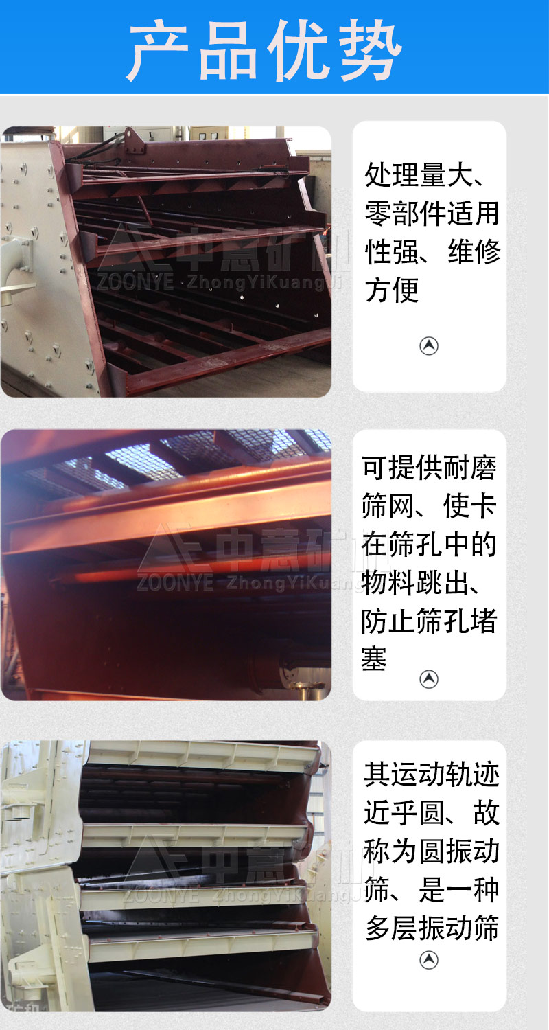 中意礦機(jī)圓振動(dòng)篩是一種做圓形振動(dòng)、多層數(shù)、新型振動(dòng)篩。圓振動(dòng)篩采用筒體式偏心軸激振器及偏塊調(diào)節(jié)振幅,物料篩淌線長(zhǎng),篩分規(guī)格多,具有結(jié)構(gòu)可靠、激振力強(qiáng)、篩分效率高、振動(dòng)噪音小、堅(jiān)固耐用、維修方便、使用等特點(diǎn),該振動(dòng)篩廣泛應(yīng)用于礦山、建材、交通、能源、化工等行業(yè)的產(chǎn)品分級(jí)。